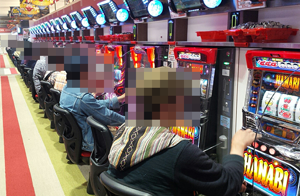 5円パチスロにも空き台はほとんどなく、AT・ART機からボーナスタイプまで、多数のプレイヤーが遊技を楽しんでいた。