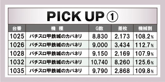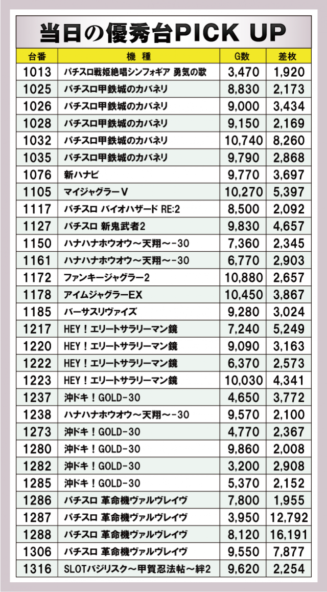 まずは今回の優秀台をご覧いただこう。差枚数的にしっかりとしたプラスとなっているのはスマスロの『パチスロ 革命機ヴァルヴレイヴ』と『HEY!エリートサラリーマン鏡』。前者は2台ほど万枚オーバーが炸裂している。また、大人気機種へと躍り出た6.5号機『パチスロ甲鉄城のカバネリ』からも1032番台が8000枚オーバー飛び出している。全体を見るとノーマルよりもAT機のほうに比重を置いている印象だ。