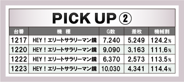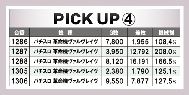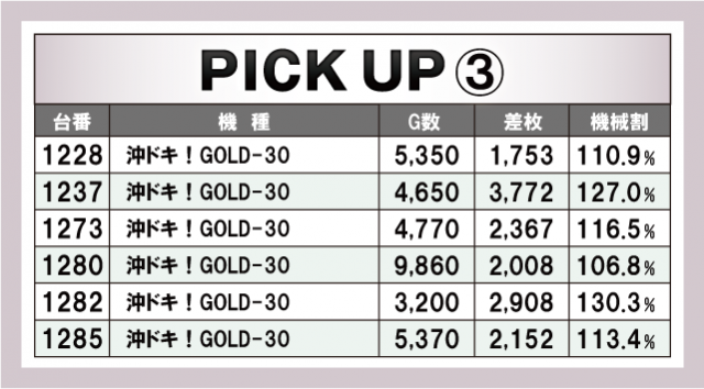 ピックアップは計4箇所。先述した機種のより詳細なデータを掲載している。『パチスロ 革命機ヴァルヴレイヴ』の1287番台は機械割が200%を超えているのはもはや笑うしかないといったところか。さきほど申し上げなかった機種では『沖ドキ!GOLD-30』が6台ほどピックアップされている。やはり地域的には力を入れていきたい機種だけに今後の動向は気になるところであろう。
