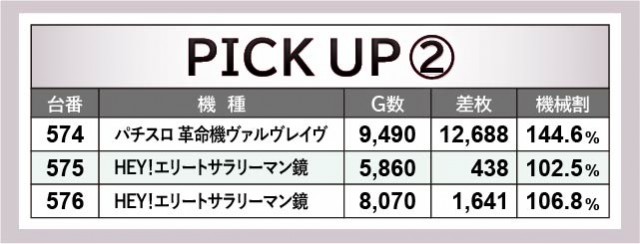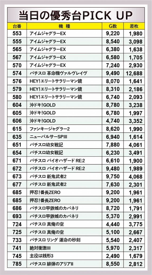 『パチスロ 革命機ヴァルヴレイヴ』574番台+12,688枚を確認でき、同機種の高いポテンシャルがしっかりと引き出され、同店の盛り上がりを牽引してくれた。他にも『パチスロ幼女戦記』651番台+4,061枚や『パチスロ 新鬼武者2』673番台+4,068枚が追随。AT機はいずれも朝からじっくりと打ち込まれ、ファンは各所で手応えを感じることができたのではないだろうか。