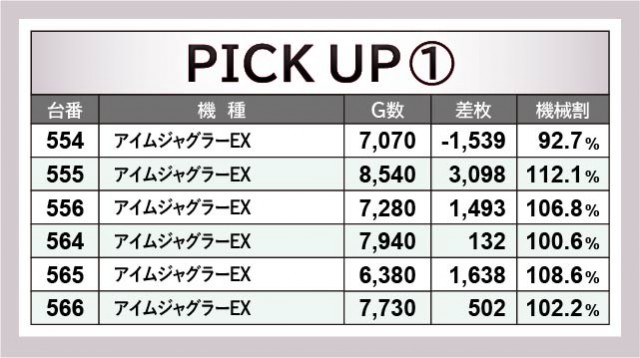 当日は3台横並びの好況スポットが形成されており、『アイムジャグラーEX』では554~556番台・564~566番台、スマスロでは574~576番台が該当した。これによって『パチスロ 革命機ヴァルヴレイヴ』574番台+12,688枚という大記録が生まれ、大きな熱量が各所へと伝播した様子だ。また555番台+3,098枚のように追随する台もあり、この状況にいち早く気づけたファンはどれほどいただろうか。