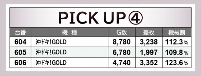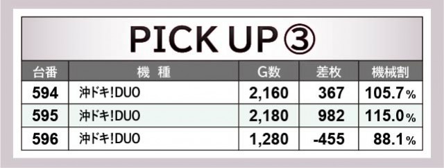 続いて沖スロコーナーでは、594~596番台・604~606番台がそれにあたる。前者はファン諸氏が見抜けなかった様子だが、対照的に後者は604番台+3,238枚・606番台+3,352枚と、熱気を放っていたのが鮮烈だ。しっかりと打ち込まれた台は、綺麗な右肩上がりのグラフを描いており、ファンは有意義な時間を過ごしていたに違いない。