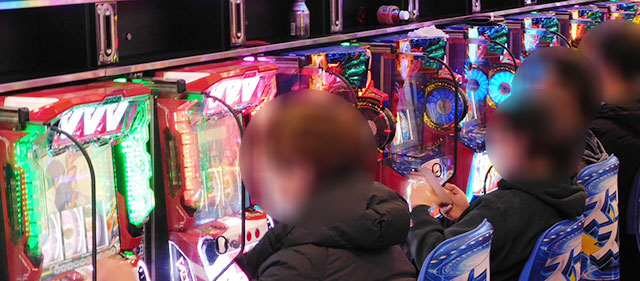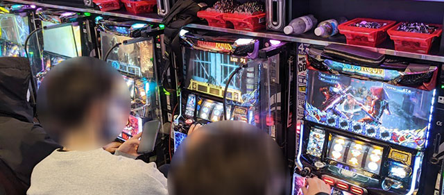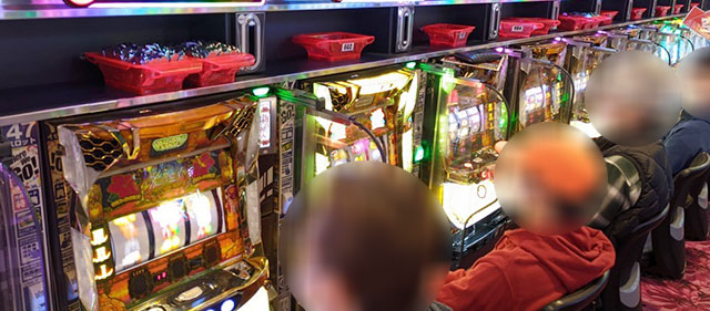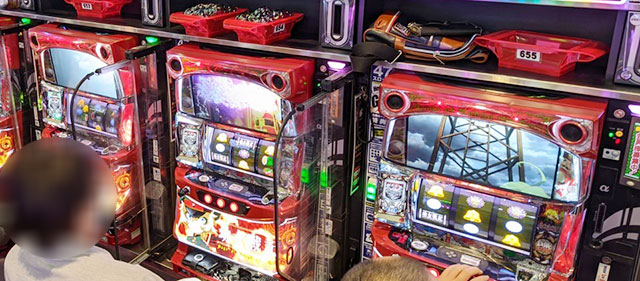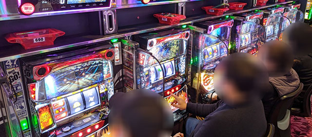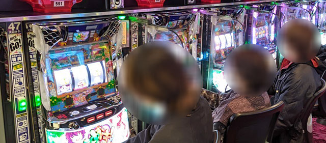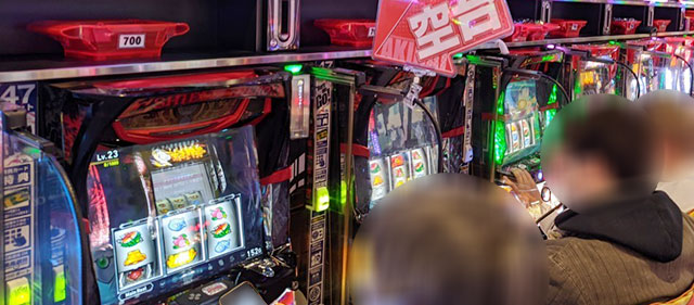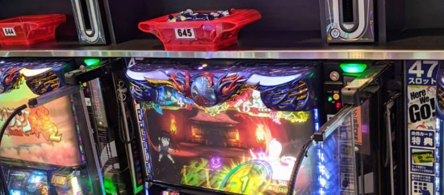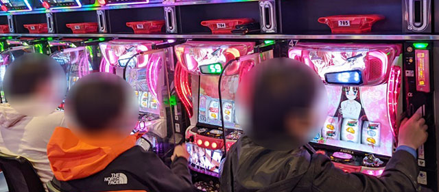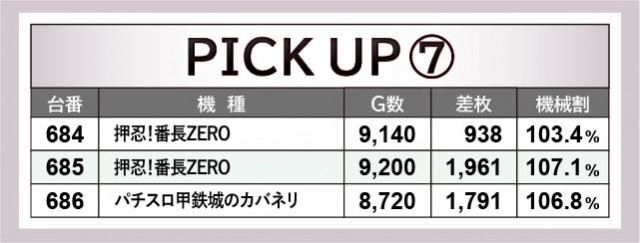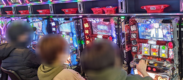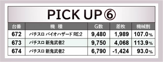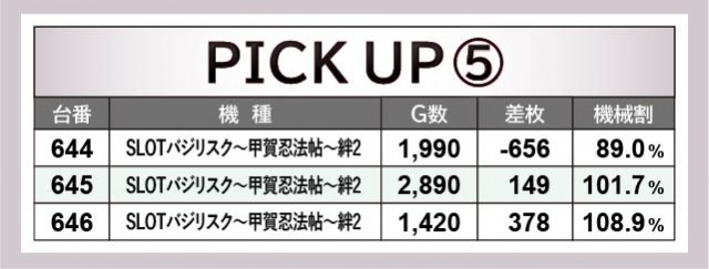 新旧の人気AT機で混成された644~646番台・672~674番台・684~686番台は、いずれも朝からじっくりと打ち込まれていた。『SLOTバジリスク~甲賀忍法帖~絆2』こそ早い段階で見切られてしまった様子だが、腰を据えてレバーを叩いていれば、結果が大きく変わったのは間違いなく。一方で『パチスロ 新鬼武者2』673番台+4,068枚を始め、『パチスロ バイオハザード RE:2』『押忍!番長ZERO』『パチスロ甲鉄城のカバネリ』でもしっかりとゲーム数が重ねられるなど、ファンは状況を見極めていたと言える内容だ。