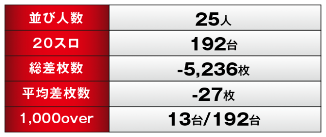 3月28日、今月2度目の「ヒーローズレポート」が「千葉県松戸市稔台」にて実施された。現在、連敗中だけに、なんとか今回こそはV字回復に期待したいところ。スペシャルレポーターでナミも参戦するなか、果たして気になる結果は…残念ながら上表の通り差枚数トータルマイナスに終わってしまった。とは言え、見どころは必ずあったはず。以下から20スロ全192台の出玉詳細データと共にこの日の様子をお伝えしていこう。