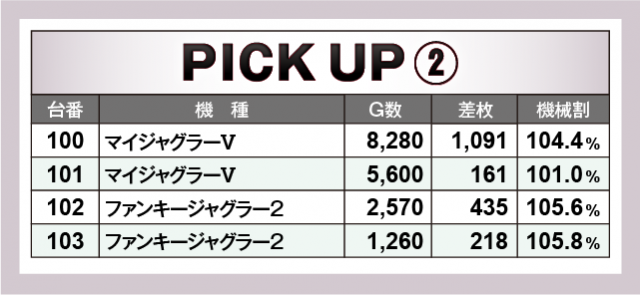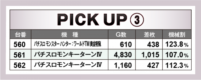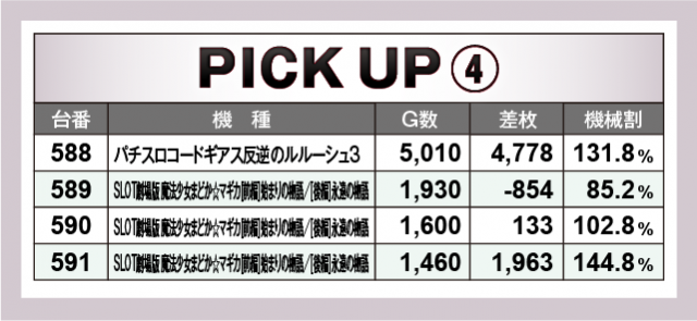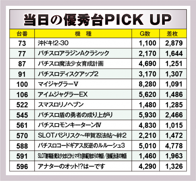 まずは優秀台PICK UPから。定例では30台の優秀台に迫るのだが、今回は13台となり、30台に至らなかったのが残念。突出して目立っていたのが588番台の『パチスロコードギアス反逆のルルーシュ3』で+4,778枚を獲得し、この日のトップ差枚数を記録した。ほか、73番台の『沖ドキ!2-30』で+2879枚をマークし目立っていた。