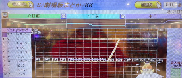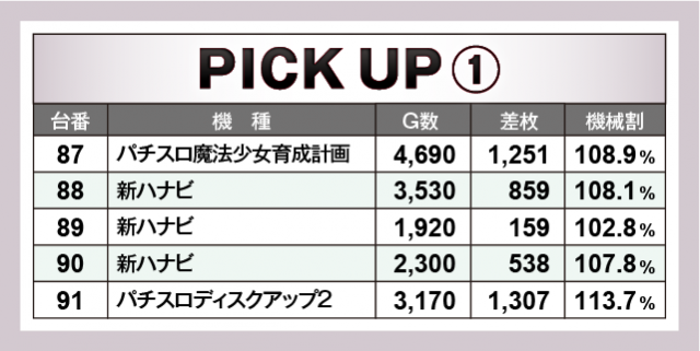 続いては4か所の横並び好況スポット計24台をチェック。マイナス台を含みつつも、中でも『パチスロ魔法少女育成計画』『パチスロディスクアップ2』でそれぞれ+1千枚を突破。また、『マイジャグラーV』『パチスロモンキーターンⅣ』でもそれぞれ+1千枚を突破した。そして『SLOT劇場版 魔法少女まどか☆マギカ[前編]始まりの物語/[後編]永遠の物語』では+2千枚クラスに迫る記録を輩出した。