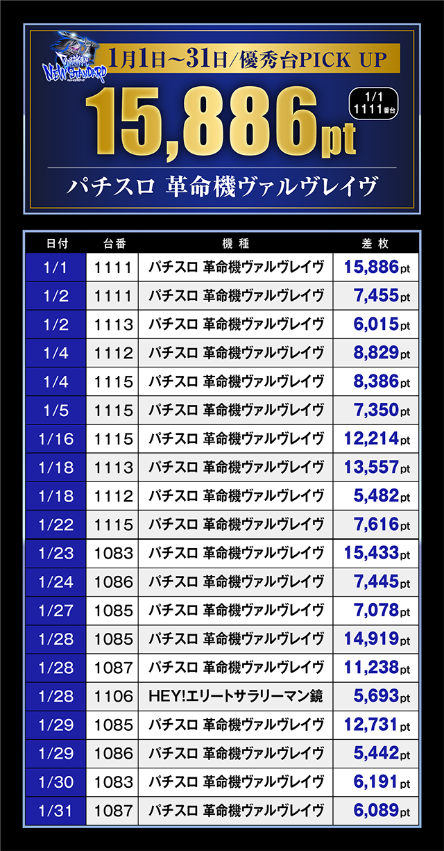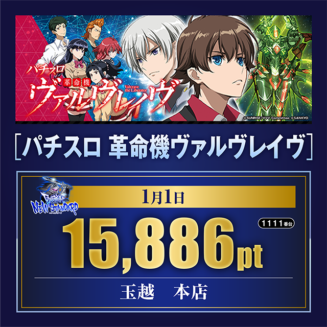 1日に好記録を残した1111番台、23日の1083番台と、1月は「パチスロ 革命機ヴァルヴレイヴ」に魅力的な台を連日のように確認。まさしく新時代と呼ぶにふさわしい光景がみられた。
