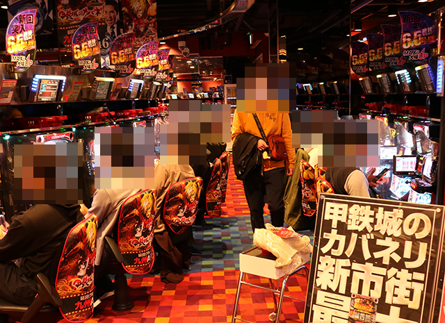 となりに設置された「パチスロ モンスターハンターワールド:アイスボーンTM」で遊技をおこなう姿も楽しげであり、シマ内には華やかな光景が広がっていた。