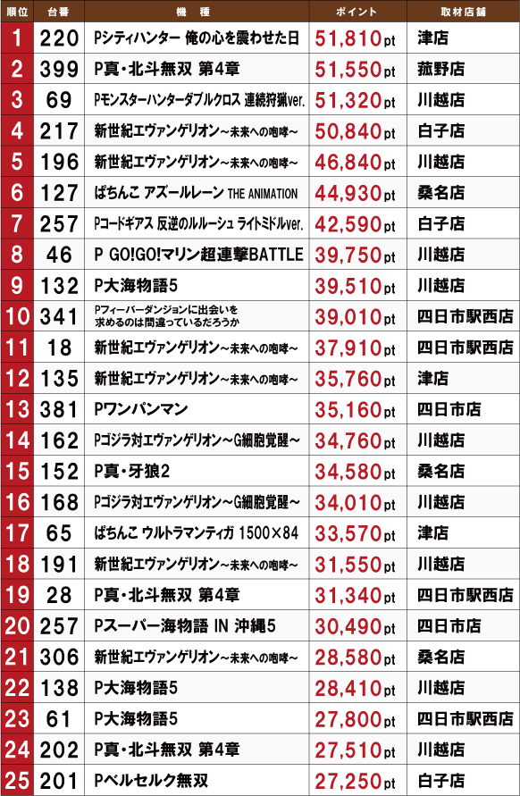 今月の「ホームランボール」の結果をお伝えしよう。先月に引き続き、『新世紀エヴァンゲリオン~未来への咆哮~』VS新機種の様相に変化はない。差玉トップに躍り出たのは津店の『Pシティーハンター 俺の心を震わせた日』の220番台。51,810ptという素晴らしい結果となっている。次いで菰野店の『P真・北斗無双 第4章』の399番台から51,550ptと最近のパチンコの出玉性能がいかに抜群かを思い知らされる。『エヴァ』だけではないことが十分お分かりいただけるだろう。来月以降も楽しみな展開と言える。次回、4月15日(土)のホームランボールにも期待したい。