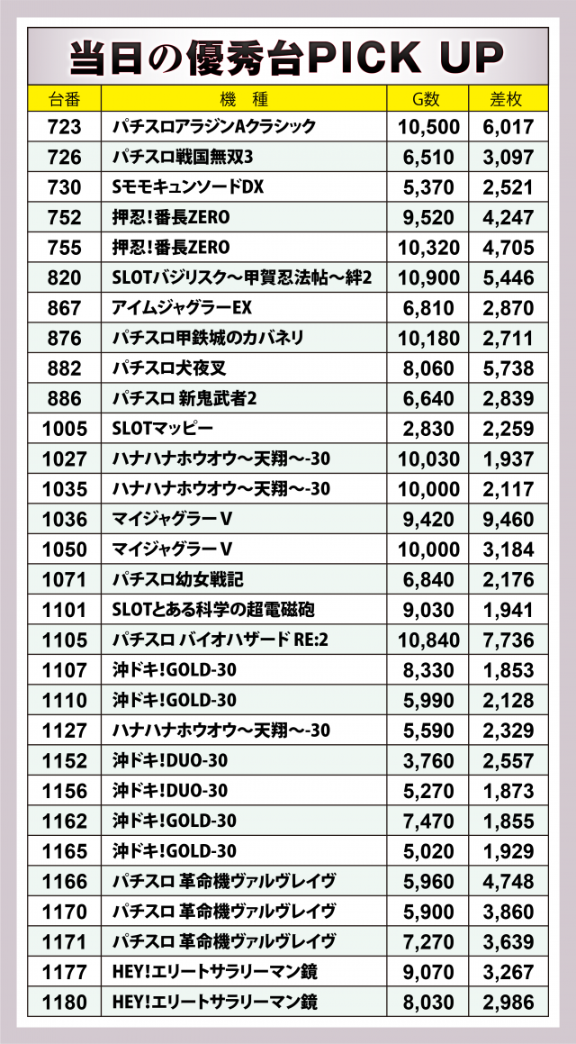 まずは優秀30台のPICK UPから。30台のうち全体の8割となる24台が差枚数+2千枚以上を達成、+3千枚以上は13台、+4千枚オーバーは8台、+5千枚オーバーは5台となった。後述する好調4機種以外では、驚きの+9千枚突破台を含め2台で+1万2千枚を突破した『マイジャグラーⅤ』、+8千枚到達が見えた『パチスロ バイオハザード RE:2』、+6千枚オーバーを記録した『パチスロアラジンAクラシック』、共に+5千枚をクリアした『SLOTバジリスク~甲賀忍法帖~絆2』『パチスロ犬夜叉』、+4千枚×2&2台トータルで+9千枚目前の『押忍!番長ZERO』といったマシンが好記録を刻んだ。