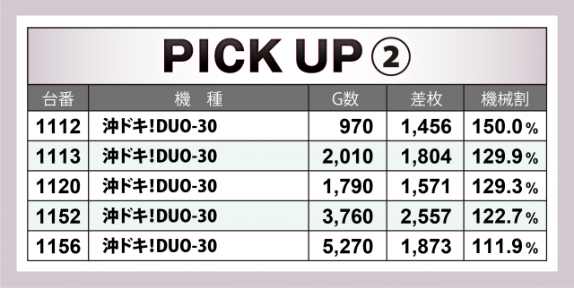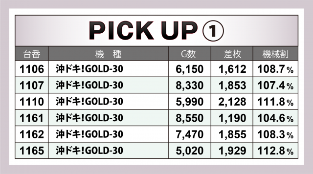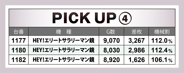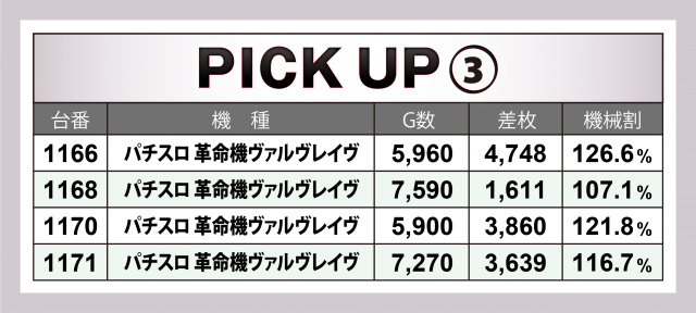 続いては当日好調だった4機種計18台をチェック。18台全てが4桁プラスを実現する中、まず注目はスマスロ『パチスロ 革命機ヴァルヴレイヴ』『HEY!エリートサラリーマン鏡』の2機種。前者は+5千枚弱×1&+3千枚超×2で4台のトータルでは+1万4千枚達成が目前、後者は3台の合計が+8千枚弱に迫った。また、30パイマシンの設置台数が多い同地域で『沖ドキ!GOLD-30』『沖ドキ!DUO-30』のシリーズ2機種が気を吐いた。『GOLD』は6台トータルで+1万枚オーバーをマーク、『DUO』は+6台の合計で+1万枚到達直前となった。