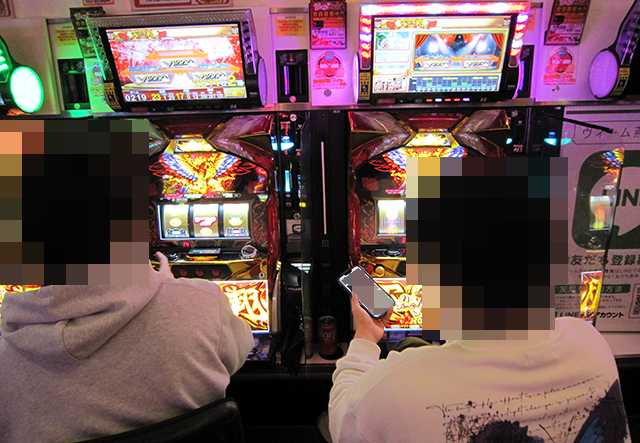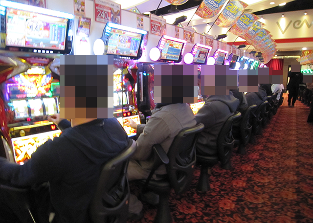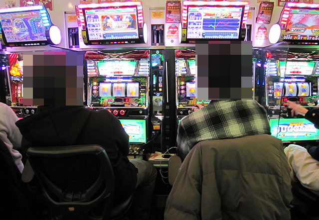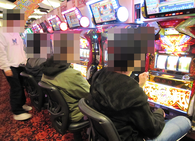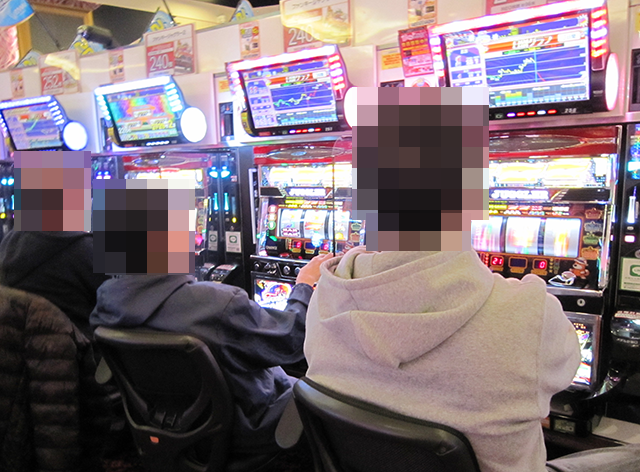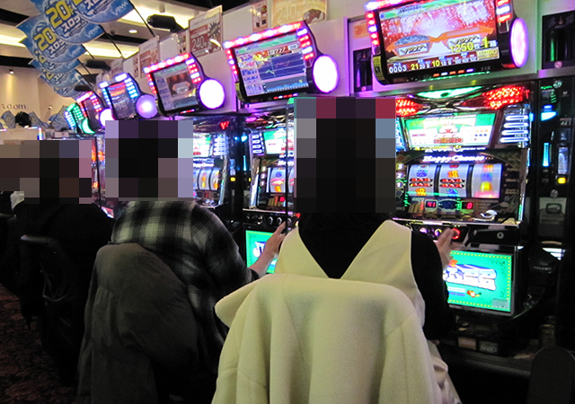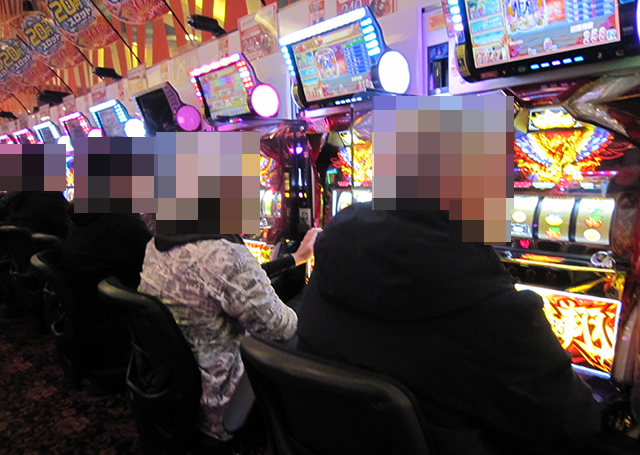貸し玉料金が3種類のパチスロ専門店であり、どの場所にも遊技を楽しむプレイヤーの姿があった。