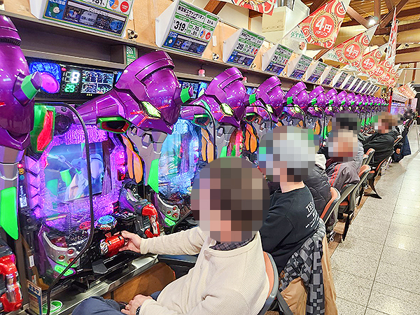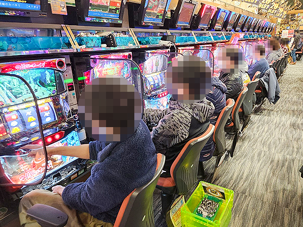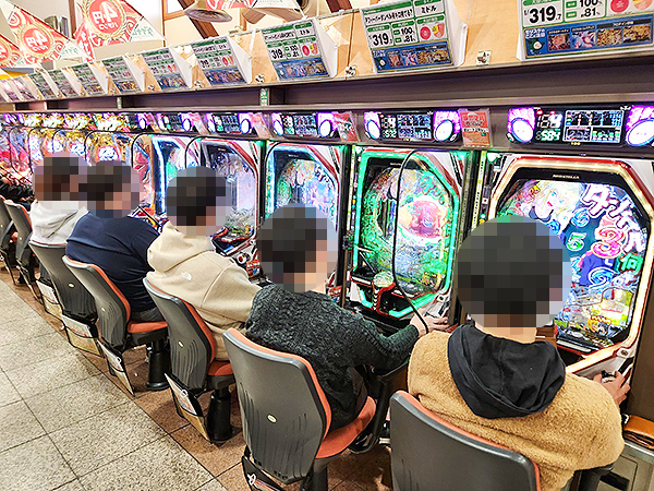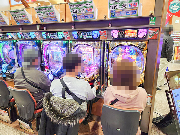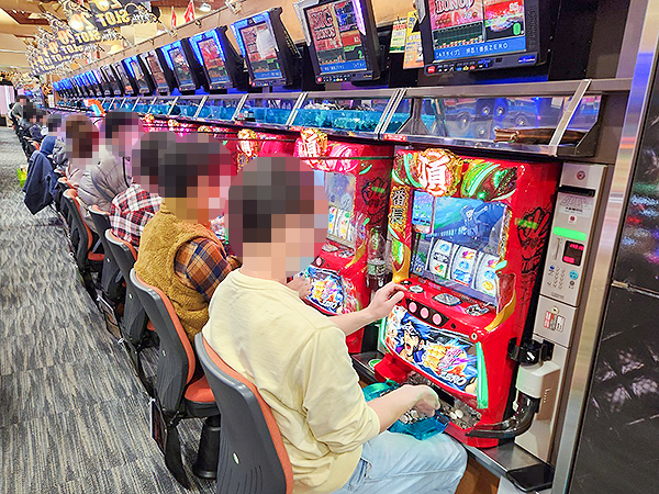 取材時は多くのプレイヤーが来店。パチンコ・パチスロともに、様々な機種が支持を得ていた。