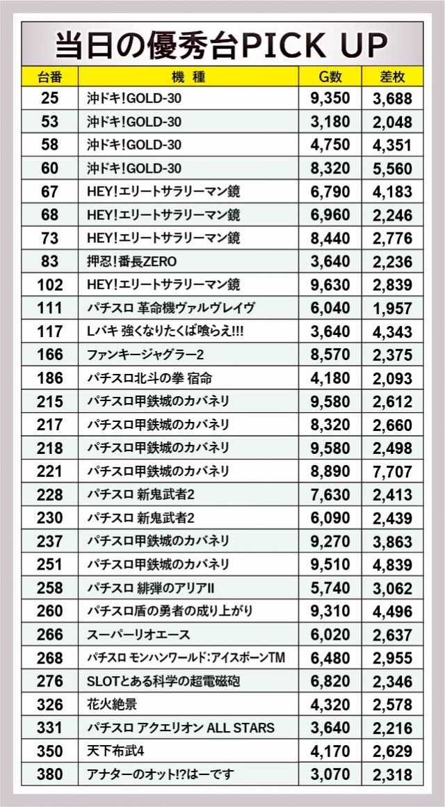 各所でじっくりと打ち込まれた形跡を確認でき、それに伴って右肩上がりのグラフを描く台が多く見られた。『パチスロ甲鉄城のカバネリ』221番台+7,707枚が最たる例であり、他にも『沖ドキ!GOLD-30』60番台+5,560枚という記録も発生。さらには3~4千枚OVERを上表から読み取れるだろう。人気機種ばかりかバラエティーコーナーの機種群も活躍し手織り、まさに館内全体が盛り上がっていたと言ってもいい内容だ。