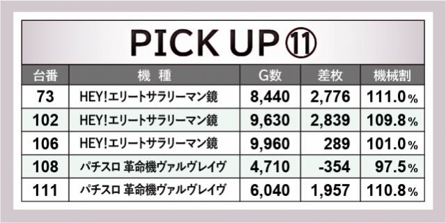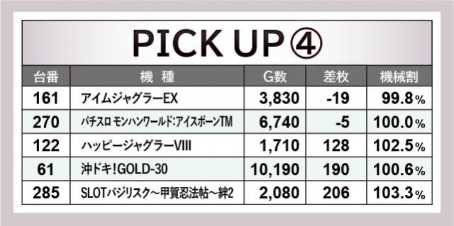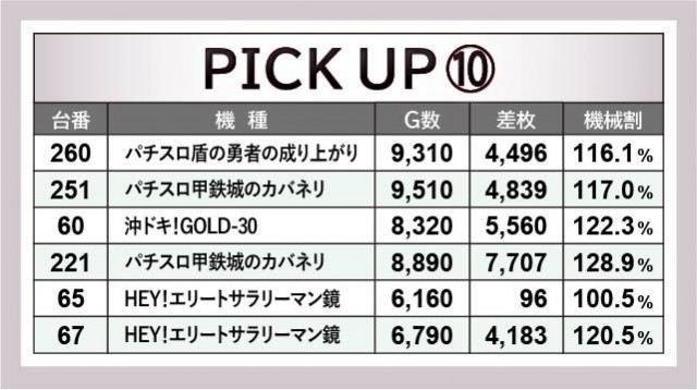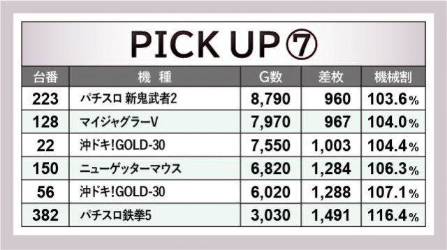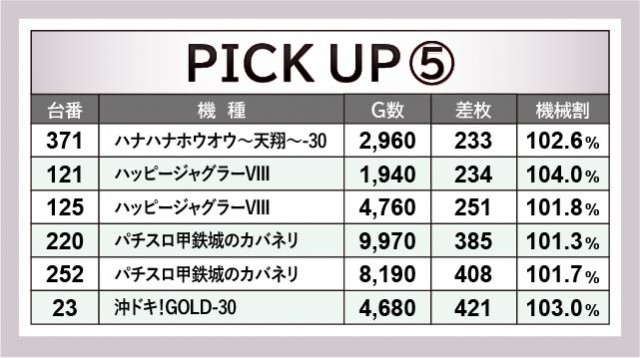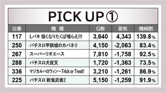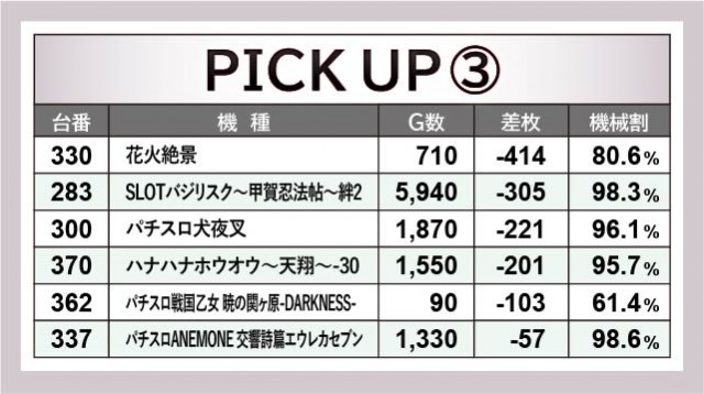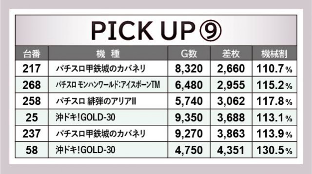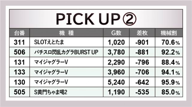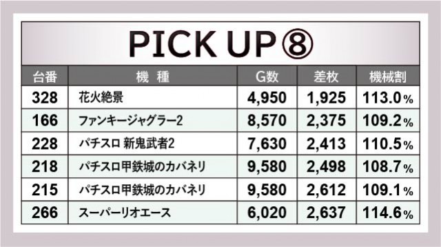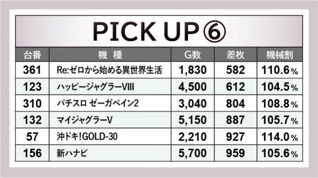 優秀台には活躍した機種が名を連ねている。しかしその一方で、ポテンシャルを秘めながらも、結果が伴わなかった台が散見された。それがここで紹介するピックアップ機種群である。しっかりと打ち込まれているが、残念ながら展開に恵まれなかった機種。また遊技していたファンに気付かれずに終えてしまった機種など、様々な台が見られるためチェックしてもらいたい。