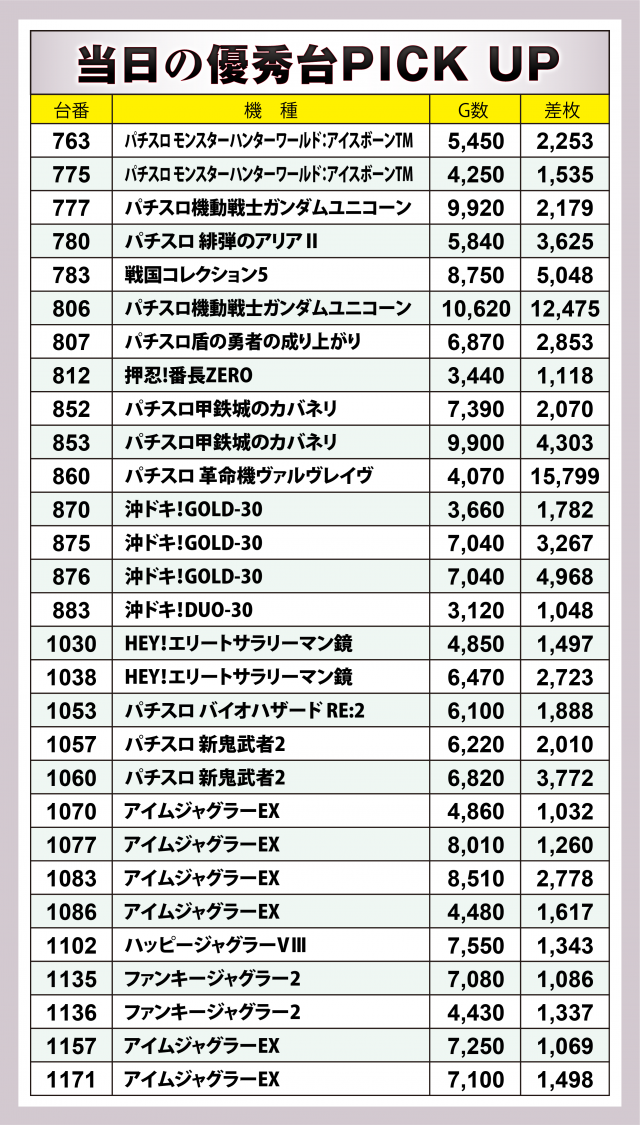 まずは優秀29台のPICK UPから。定例では30台の優秀台に迫るのだが今回はそこに1台及ばなかったのが少々残念。29台のうち15台が差枚数+2千枚以上を達成、+3千枚以上は8台、+4千枚オーバーは5台となった。後述する好調2機種以外でハイスコアを成し遂げたのは、なんと言っても共に万枚を突破した『パチスロ 革命機ヴァルヴレイヴ』『パチスロ機動戦士ガンダムユニコーン』。さらに+5千枚オーバーを記録した『戦国コレクション5』、4千枚超の台を輩出した『パチスロ甲鉄城のカバネリ』、+4千枚に迫った『パチスロ 緋弾のアリアⅡ』といったところが上位に位置した。