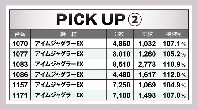 続いては好調2機種計7台をチェック。7台全てが4桁プラスをマーク。『沖ドキ!GOLD-30』では+5千枚到達が目前となる台が生じた。 また『アイムジャグラーEX』は+3千枚間近の台を筆頭に6台トータルで9千枚突破と安定の結果に終わった。