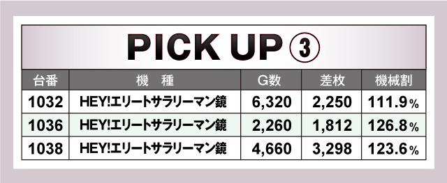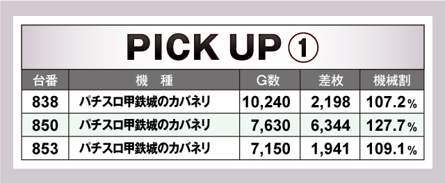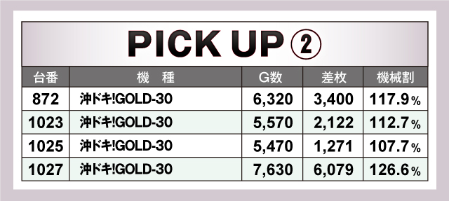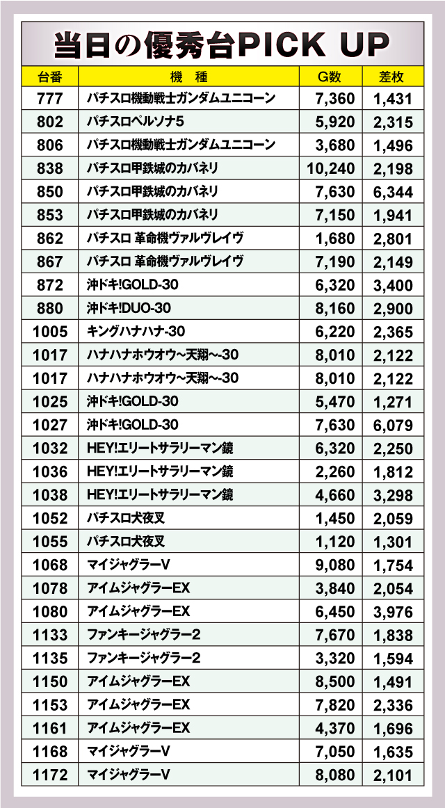 まずは優秀30台のPICK UPから。今回の「ヒーローズレポート」では、850番台の「パチスロ甲鉄城のカバネリ」の+6,344枚、1027番台の「沖ドキ!GOLD-30」の+6,079枚を筆頭に、多くの機種がランクイン。とくに6.5号機やハイスペック機種の活躍が目覚ましく、またジャグラーシリーズからも多くの台が4ケタオーバーの記録をマークしていた。幅広い機種にチャンスがあったので、今後も要チェックするべし!