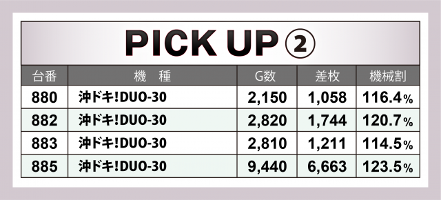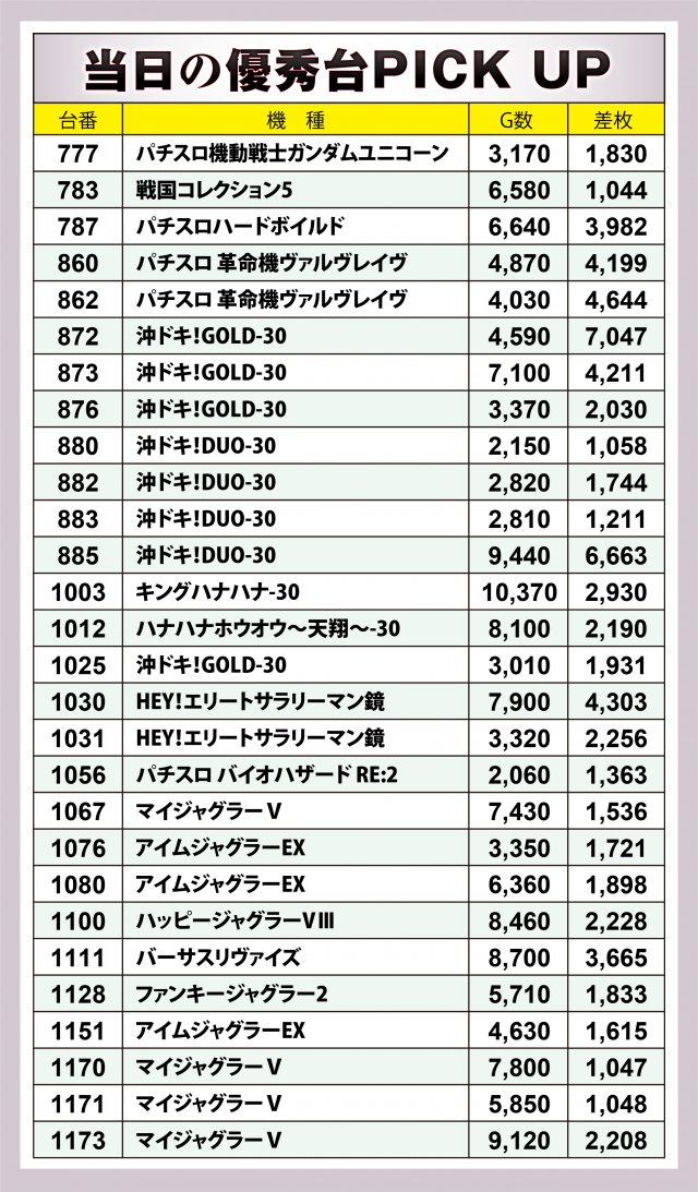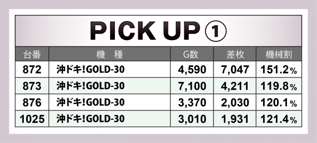 続いては当日の好調3機種計12台を深掘りする。その12台全てが4桁プラスを達成し、中でも優秀だったのが『沖ドキ!GOLD-30』。+7千枚超と+4千枚超が1台ずつ&4台の合計で+1万5千枚オーバーをマークした。次いで『沖ドキ!DUO-30』では+6千枚超の台を筆頭に4台トータルで+1万枚突破と、沖ドキシリーズ2機種のハイスコアが光った。
