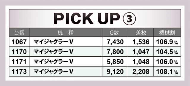この日、20スロ193台のトータル差枚数は+2,515枚で、プラスには終わったが今までの成績と比べるとその少なさが際立つ結果に。また上述した通り、1,000overは30台を切り全体の2割を切ったこともあまり頂けない。トータルプラス11連勝を成立しているが、次回の取材ではさらに白星を重ねると同時により高い差枚数とプラス台数の多さに期待したい。