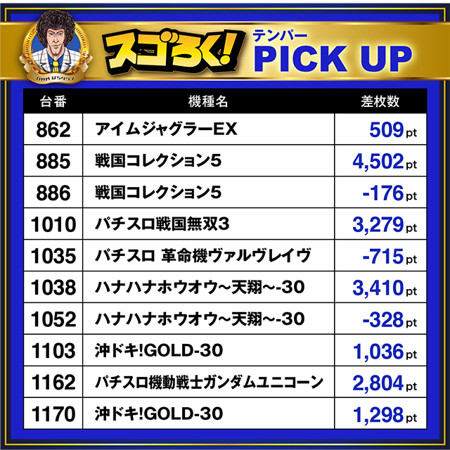 笑顔で遊技をおこなっているプレイヤーに囲まれながら、彼が選んだ10台をみていこう。