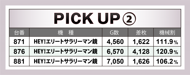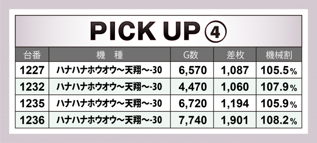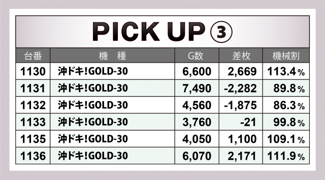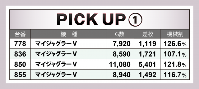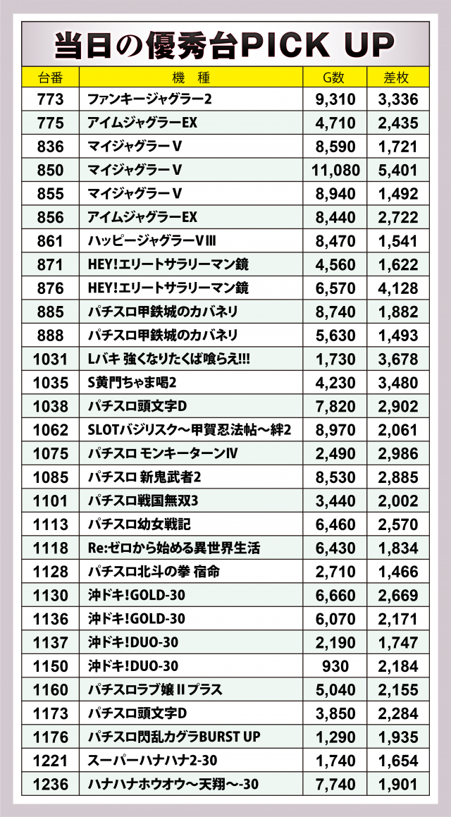 続いては当日好調だった4機種計17台をチェック。17台中13台が4桁のプラスを計上、その中で最優秀台を輩出したのが『マイジャグラーⅤ』。+5千枚突破台を筆頭に4台トータルで+1万枚到達目前となった。また『HEY!エリートサラリーマン鏡』は+4千枚強の台をトップに3台の合計は+7千枚超を達成。さらに、30パイマシンのシェアが高い地域で『沖ドキ!GOLD-30』『ハナハナホウオウ~天翔~-30』にドル箱表示台が複数見られる結果となった。