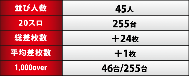 今回、[1000円/46枚]スロ255台のトータルは+100枚に満たないプラス差枚数だったが、とりあえずは白星によるスタートを切ることができた。また1,000overは全体の2割を切り、他店の取材と比較すると、もうひと声欲しい結果となった。開幕戦勝利は果たしたものの、納得できるようなスコアは次回実施時に期待したい。その時は驚くような圧倒的なトータルデータを見せつけて欲しいものだ。