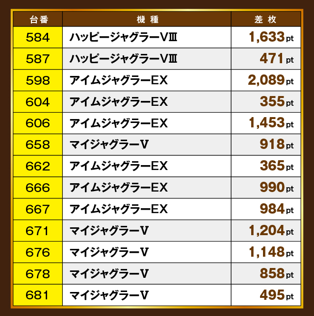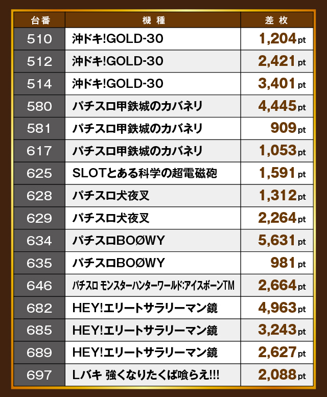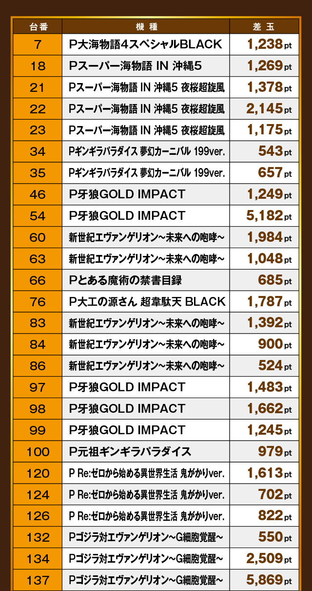今回の「ウエスタン浦安やなぎ通り店」の結果は全国制圧!前回・前々回と五カ国制圧に甘んじていただけに、今回の全国制圧は実に見事な結果だったと言えよう。六か国ともにしっかりとプラス差枚を叩き出した背景には、これまでの鬱憤を晴らすかのような執念が見て取れた。特に50台以上のプラス記録を生み出した「玉ノ国」の勢いには目をみはるものが。次回も連続全国制圧に期待ッ!