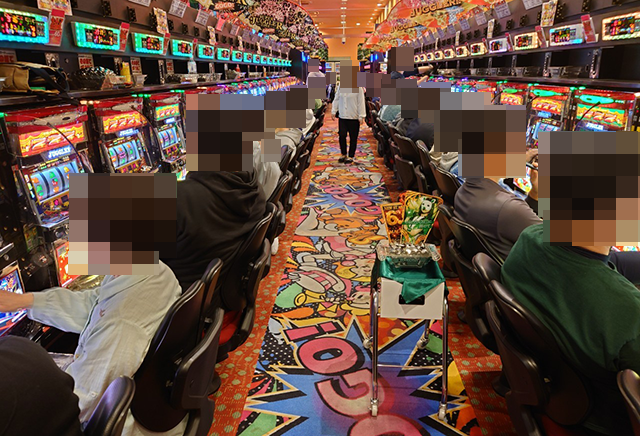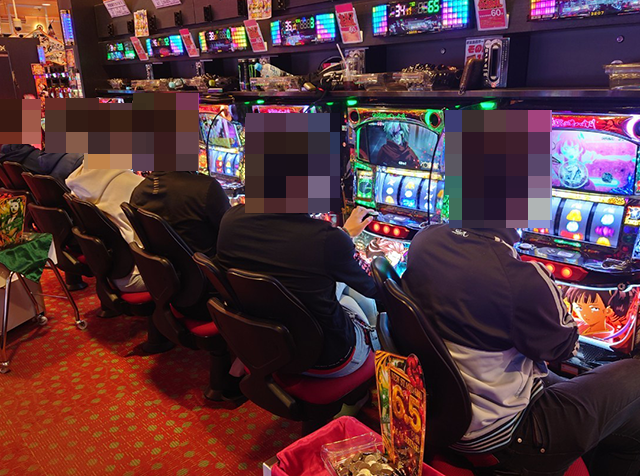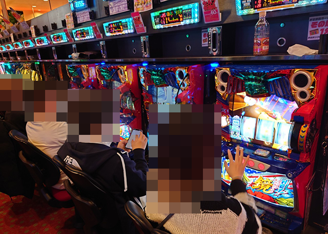 ジャグラーシリーズにも空き台は少なく、たくさんのプレイヤーが遊技をおこなっていた。