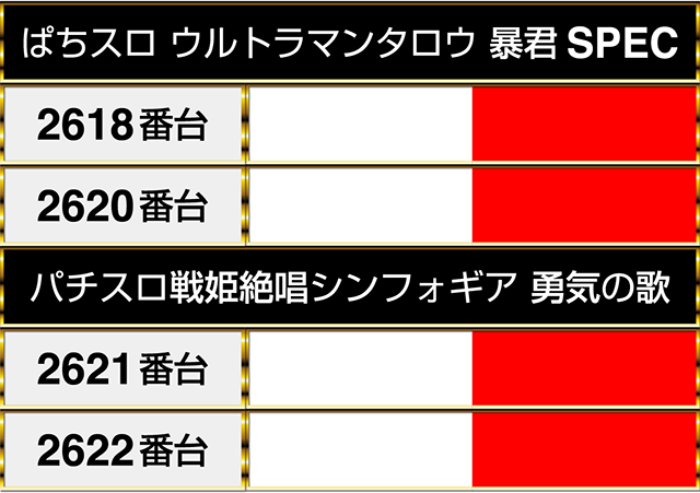 『ぱちスロ ウルトラマンタロウ 暴君SPEC』の2618番台から『パチスロ戦姫絶唱シンフォギア 勇気の歌』の2622番台までが並んでプラスpt!!