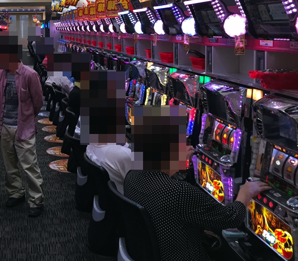 昼以降の様子をみてみると、20円パチスロでは「パチスロ北斗の拳 転生の章」、「アナザーゴッドハーデス」や「沖ドキ!」などが大盛況。