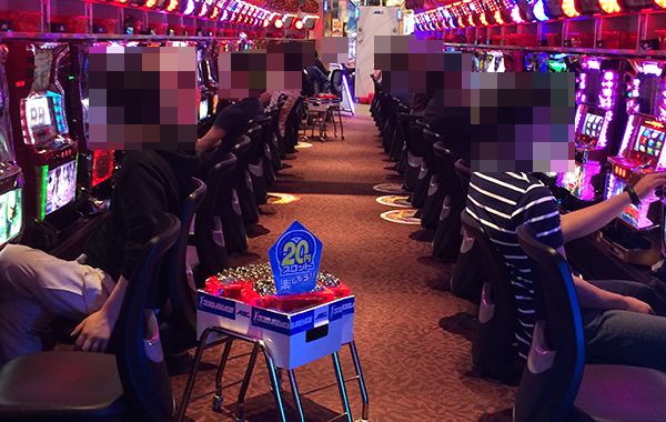 15時過ぎの20円パチスロをみると、朝から人気の「バジリスク~甲賀忍法帖~絆」や「アステカ-太陽の紋章-」、「ミリオンゴッド-神々の凱旋-」など多数の場所が活気づいており、機種の性能を引き出しているような姿も多数。