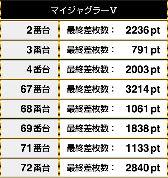 総ゲーム数が7000Gを超える台が多く、長時間にわたって楽しまれていた『マイジャグラーⅤ』!