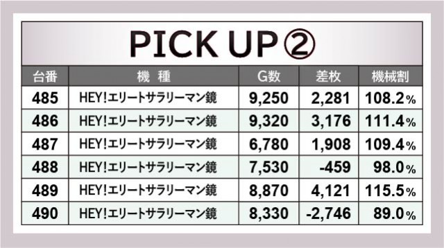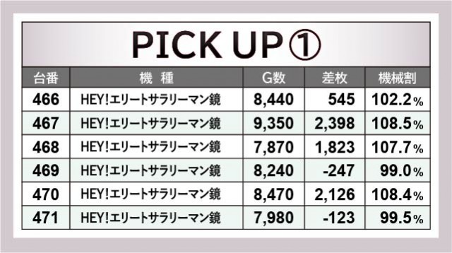 『HEY!エリートサラリーマン鏡』からは468番台+3,176枚や489番台+4,121枚など、スマスロの人気をリードする機種らしい活躍が見られた。回転数を見ても8~9千回転台が多くなっており、遊技していたファンはどれほどの手ごたえを感じていたのかが想像に容易い。大きなマイナスも少なく、活気&熱気ともに最高だった島と言えるだろう。