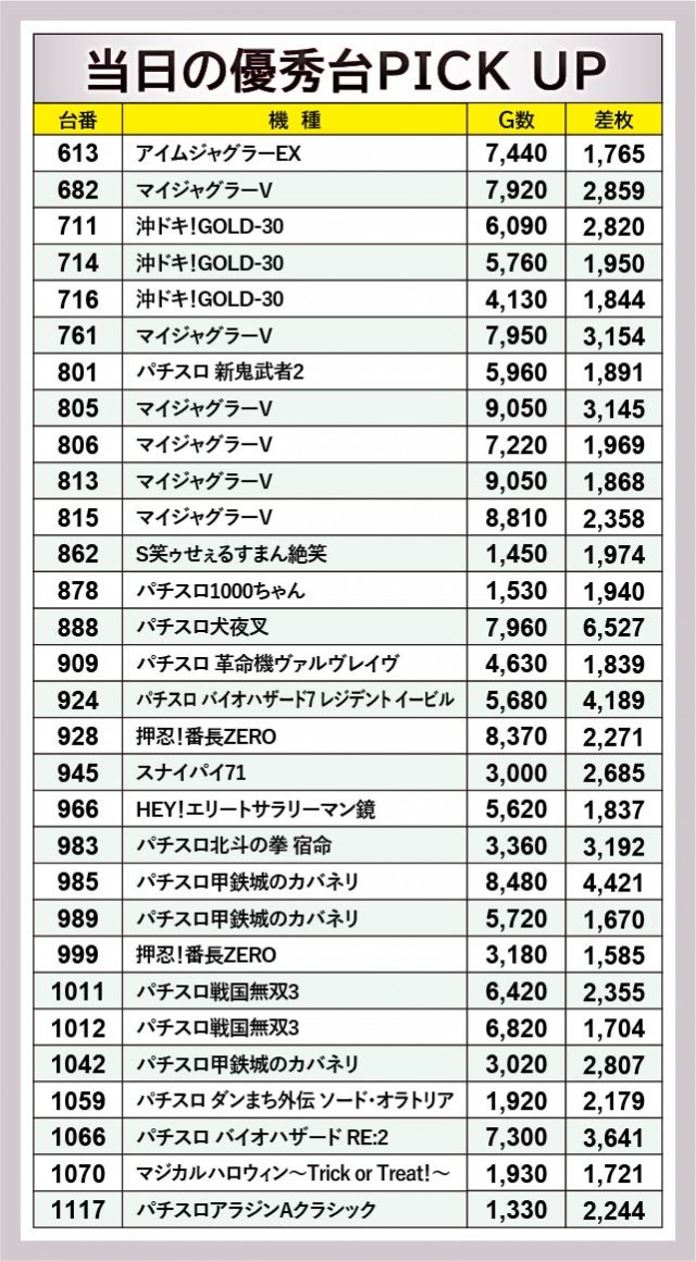 『パチスロ犬夜叉』888番台+6,527枚を筆頭に、『パチスロ甲鉄城のカバネリ』985番台+4,421枚や『パチスロ バイオハザード RE:2』1066番台+3,641枚といった熱気が各AT機にて発生した。これらに負けじと、まとまりのある活躍を披露していたのが『沖ドキ!GOLD-30』と『マイジャグラーⅤ』である。以下からは両機種をより詳細に触れていくため、ぜひそちらもチェックしてもらいたい!