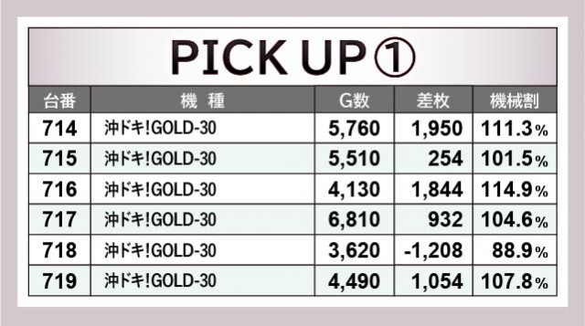 『沖ドキ!GOLD-30』は各所でじっくりと打ち込まれており、特に注目を集めたエリアが714~719番台だった。全台プラス差枚とはならなかったものの、コンスタントなボーナスによって、2千枚近い出玉を放った台を確認できたのが好印象だ。遊技していたファンも手ごたえを感じていた様子で、より多くの回転数が消化されれば、より大きな差枚を築き上げたのは間違いない。