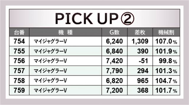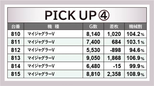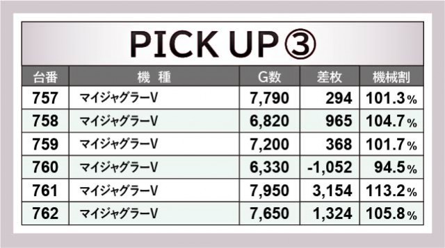 一方で『マイジャグラーⅤ』は、朝から閉店まで打ち込まれる状況となっていた。754~762番台・810~815番台がポテンシャルを放っていたエリアとなり、大きなマイナス差枚が見当たらないのが何よりも好印象だ。ファンは回転を重ねるたびに確信を得ていただろうし、レバーを叩く力も強くなっていったはず。打ちごたえのある状況となっていたため、有意義な時間を過ごしていたことだろう。
