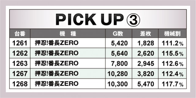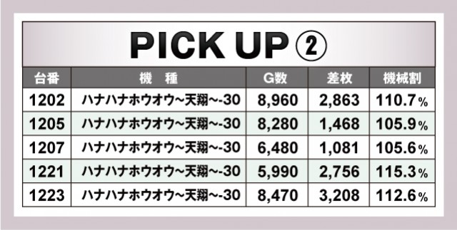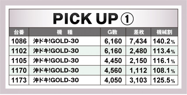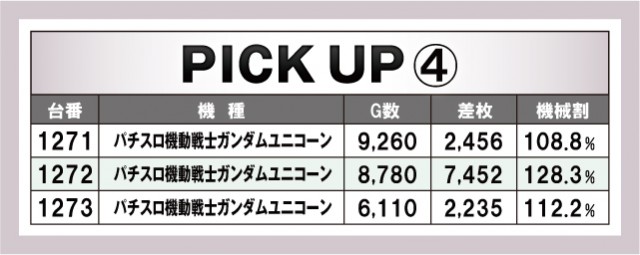 今回のピックアップは4機種。まさに『DAMZ柏崎店』の推しがここにピックアップされているということだろうか。さきほどもご紹介した通り、『パチスロ機動戦士ガンダムユニコーン』と『沖ドキ!GOLD-30』の優秀台を筆頭にその他のプラス差枚数台も掲載されている。なお、ノーマルタイプからは『ハナハナホウオウ~天翔~-30』の優秀台をピックアップ。今回のプラス差枚数が載っているのでチェックしておいて欲しい。