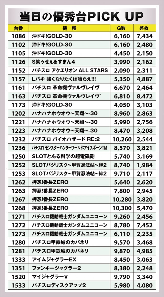 まずは今回の優秀台をチェック! ここに掲載されている台は全て2000枚オーバー。さらにはノーマルタイプやAT機、スマスロに至るまで万遍なく優秀台があるのが見て取れる。差枚数トップは『パチスロ 革命機ヴァルヴレイヴ』の1163番台。+8,472枚となっており、スマスロらしい出玉感を演出している。次いで、『パチスロ機動戦士ガンダムユニコーン』の1272番台から+7,452枚。『沖ドキ!GOLD-30』の1086番台から+7,434枚となっており、6.5号機も負けてはいない差枚数となった。
