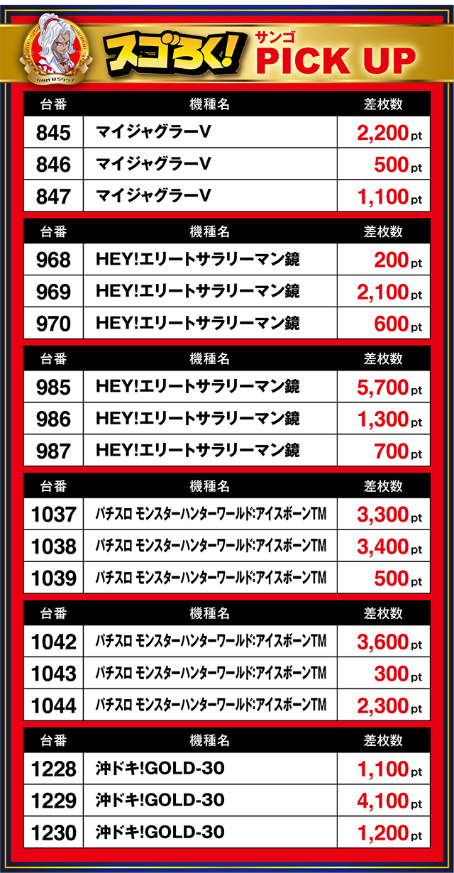 機種全体が盛り上がっていた新台の「パチスロ モンスターハンターワールド:アイスボーンTM」から、2ヶ所をチョイス。