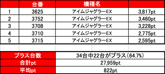 4機種合計68台が活躍のジャグラーシリーズも人気・状況ともに高く、この日は4機種全てが合計ptプラスを記録!