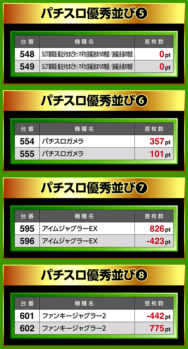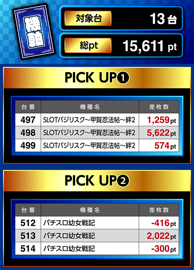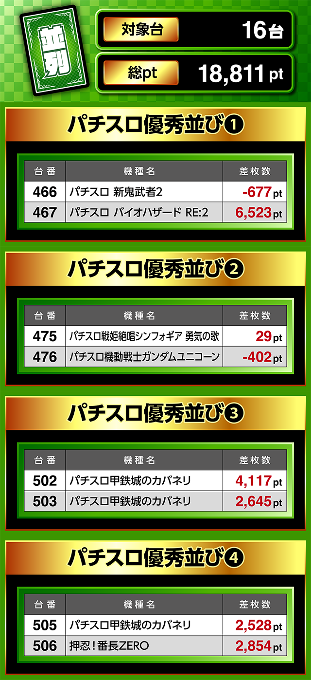 並列は8ヶ所、機軸は4機種と多数のポイントで優秀台を確認。どちらも総ptは15,000ptオーバーを記録した。