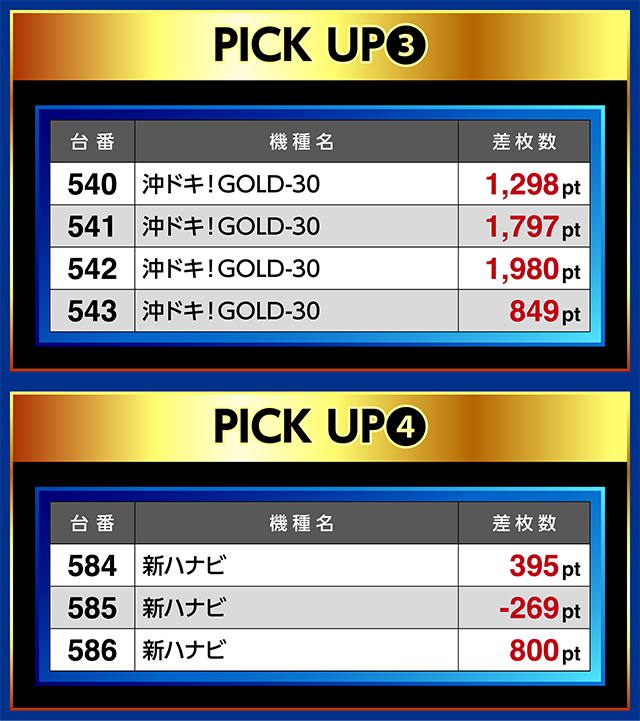「沖ドキ!GOLD-30」は540番台から542番台までの3台が1,200ptを上回った。