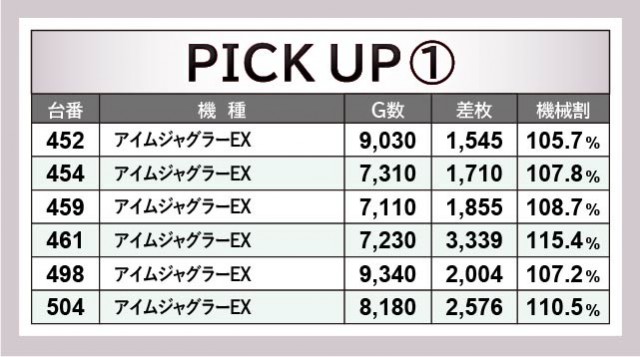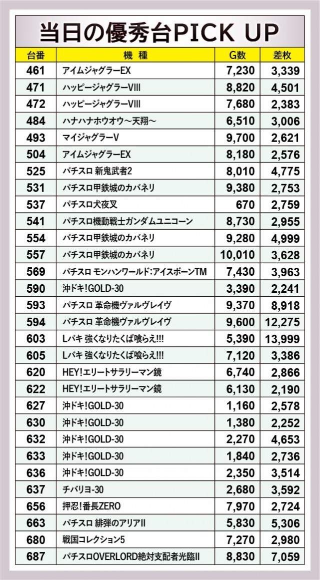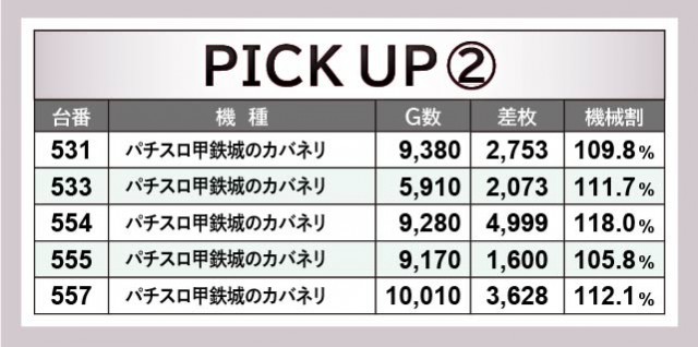 安定感のあるパフォーマンスを披露していた『アイムジャグラーEX』は、各所で朝からじっくりと打ち込まれた形跡が窺える。461番台+3,339枚という大きな差枚数はもちろん、右肩上がりに伸びる出玉は、自信を深めるのに十分だったはずだ。また『パチスロ甲鉄城のカバネリ』554番台+4,999枚・557番台+3,628枚という数字も見られ、こちらもまた万回転OVERが発生した事実から、相当な手ごたえを感じていたことだろう。