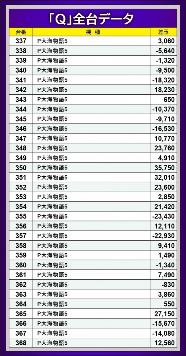 『P大海物語5』の島は、誰もがリラックスしてハンドルを握っていた。ストレスフリーで楽しめる状況下、350番台+35,750玉や351番台+32,010玉という大きな記録が並びで発生。さらには2万発OVER台も数多く、熱気を放っていた様子が目に焼きつく。初当りだけでなく連チャンにも恵まれ、ファンは間違いなく心から遊技を楽しんでいたことだろう。