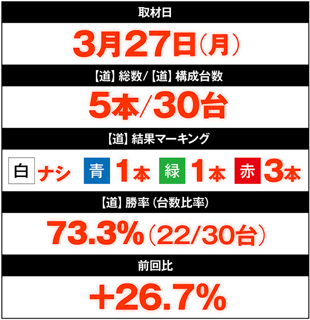 前回は【道】勝率をダウンさせてしまったものの、この日のパチスロコーナーの大当り状況を確認した限りでは、今回は好調の兆しを見せている。