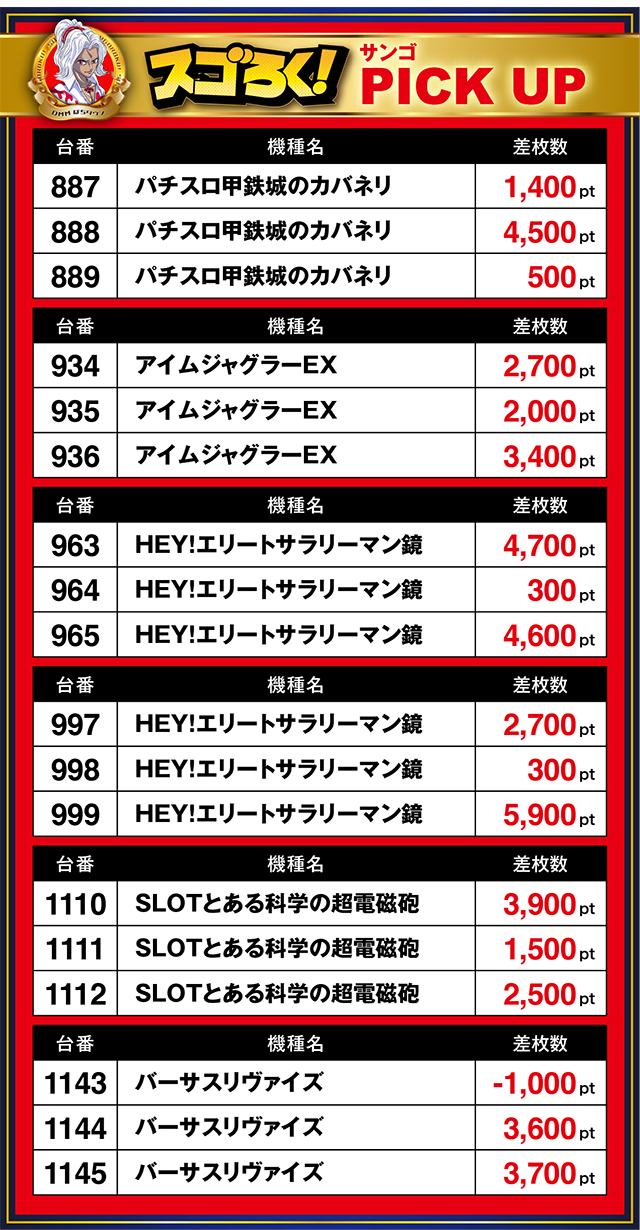 最終的に6台のすべてがプラスとなり、4,500ptオーバーが3台。999番台は約6,000ptを記録したぞ。