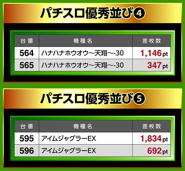 「ハナハナホウオウ~天翔~-30」と「アイムジャグラーEX」といったボーナスタイプでも、プラスが連なる結果となった。