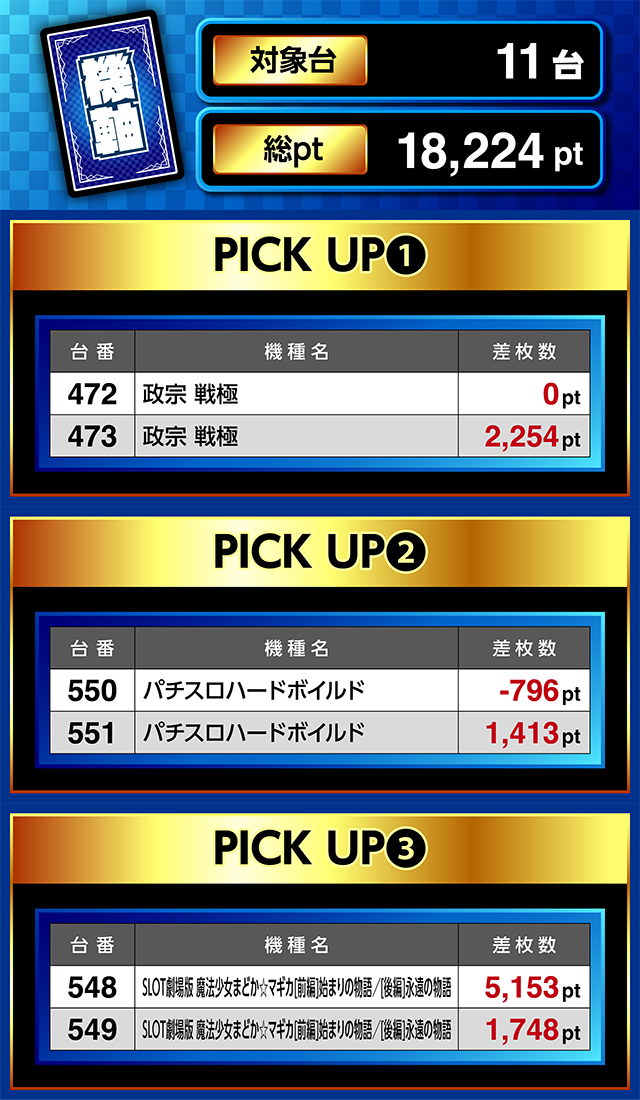 「政宗 戦極」は2,200ptを超え、「SLOT劇場版 魔法少女まどか☆マギカ[前編]始まりの物語/[後編]永遠の物語」は7,000ptクラスであった。