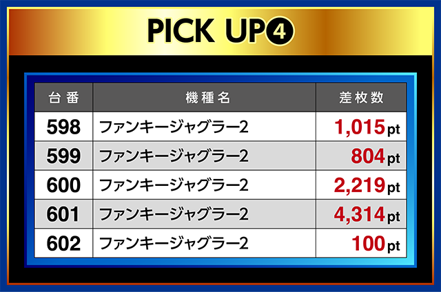 「ファンキージャグラー2」も5台のすべてがプラスを記録し、4,300ptを超えた台もあった。